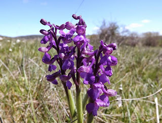 Zo´n 10 dagen geleden stuiten we bij toeval op een enorm veld vol met wilde orchideeën. Het gaat om een in de streek vrij algemene orchidee, n.l. de slanke harlekijn. De wetenschappelijke naam is Anacamptis morio subsp. picta hoewel veel botanici het beschouwen als een aparte soort, de Anacamptis picta. Maar goed, plotseling zagen we dus een afgezet veld werkelijk afgeladen met orchideeën. Gelukkig werd het veld niet begraasd door vee, hoewel begrazing na de bloeitijd wel positief is voor het orchideeën bestand. Het aantal slanke harlekijntjes dat aanwezig is is werkelijk overweldigend, zodanig zelfs dat er een purperen gloed over het hele veld ligt. De oppervlakte van het veld dat is bedekt met orchideeën is ongeveer 10 hectaren groot (gemeten op luchtfoto´s) en een voorzichtige schatting is dat er beduidend meer dan vijfhonderd duizend (500.000) orchideeën bijeen staan. Zo iets bijzonders moet natuurlijk wel gedeeld worden, hoewel de exacte lokatie natuurlijk niet genoemd kan worden.
